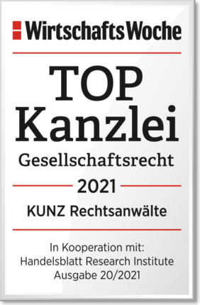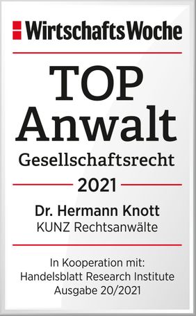 Im aktuellen WirtschaftsWoche Ranking zu den besten Kanzleien und Anwälten auf dem Gebiet des Gesellschaftsrechts wurde KUNZ Rechtsanwälte -wie schon im Vorjahr- abermals zur TOP Kanzlei Gesellschaftsrecht 2021 gekürt. KUNZ Partner Dr. Hermann Knott wurde als TOP Anwalt Gesellschaftsrecht 2021 ausgezeichnet.